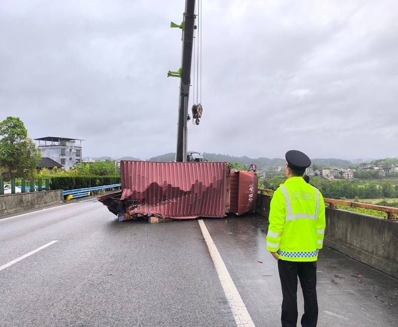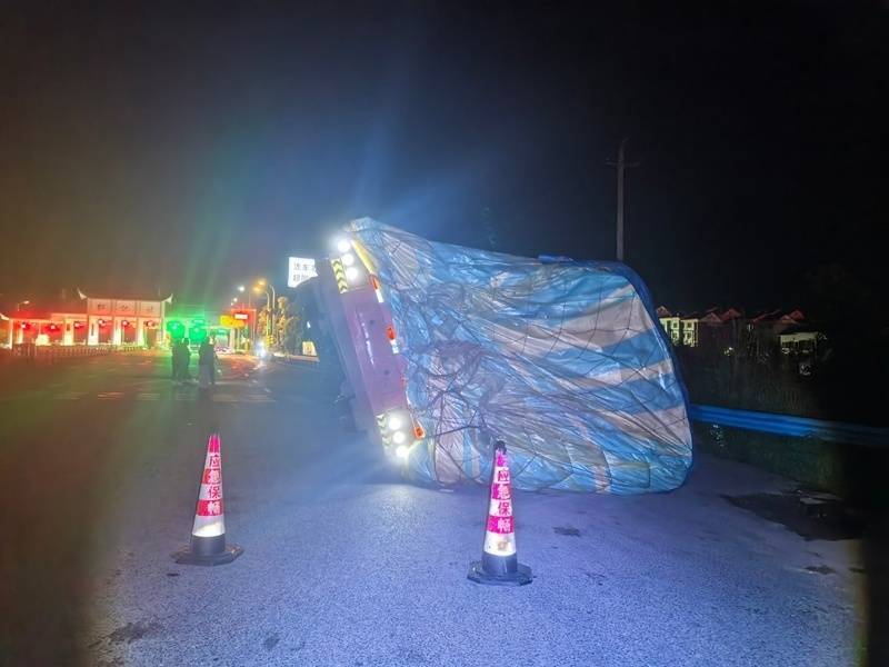 4月17日,松桃北收费站外广场处有一辆货车发生侧翻,车体倾斜占用部分通行区域,影响收费站进出车辆正常通行,且夜间视线较差,隐患风险突出。二大队执法人员迅速集结赶赴现场,结合收费站周边通行特点,合理设置警戒区域,全面排查现场安全隐患,同步联动交警、清障等单位制定处置方案。执法人员全程坚守现场,维持通行秩序,配合救援人员开展车辆扶正、转运及现场清理工作,高效完成处置任务,及时恢复收费站外广场正常通行秩序。