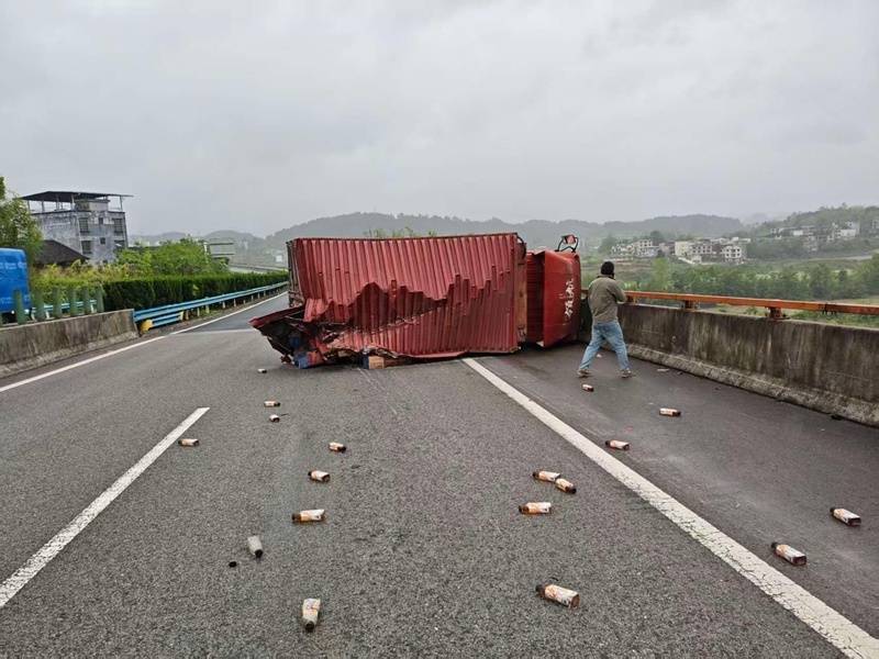 4月20日,S15松从高速K17+900上行路段突发险情,一辆两轴货车侧翻横卧在行车道与慢车道上,车上运载的饮料倾泻而出,铺满路面,交通严重受阻。二大队接警后,迅速响应,即刻启动“一路多方”联勤联动机制,联合交警、养护、清障等部门火速赶往现场。抵达后,执法人员立即管控现场安全,摆放警示标志、划定警戒区,引导车辆有序通行,严防二次事故。近两小时连续奋战,饮料转运完毕,路面清理干净,车辆拖离现场,道路恢复正常。