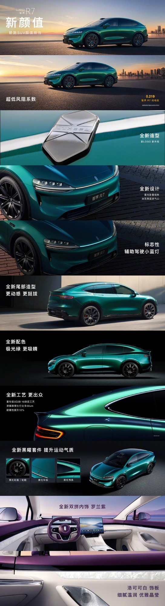 新款智界 R7轿跑 SUV,以 “全新” 定义颜值新标杆:突破式造型设计重塑轿跑 SUV 轮廓,焕新极光绿车色演绎灵动格调,专属罗兰紫内饰升级座舱质感,搭配辨识度十足的智驾小蓝灯与运动黑曜套件,从外到内皆焕新,处处尽显耳目一新的精致感。