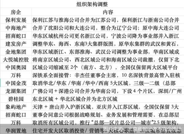 一如扩张期的拆分与放权,房企进入调整期后,重新整合组织架构成为共识。8月7日,据北京商报记者不完全统计,今年1—7月,保利发展、华润置地、招商蛇口、龙湖集团等10余家房企调整组织架构。从区域放权到强化总部,从细分小区到整合大区,强化风控等部门成为本轮房企组织架构调整的共同选择。